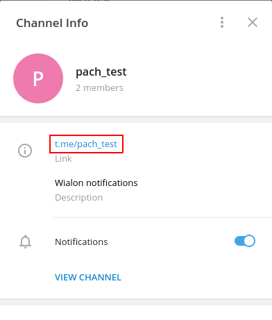 Take only the “pach_test” part (without the symbols “t.me/”), put the “@” prefix, and add it to the notification in Wialon like this:
