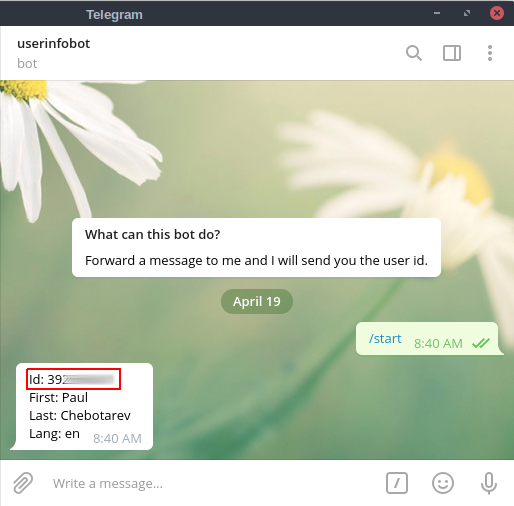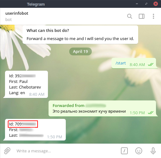 To find out the ID of another user, simply forward this user’s message to them (for example, if you already have a chat with them, you may forward this message from there):