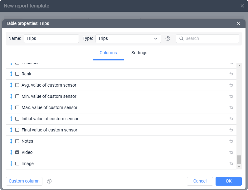 Recordings are also available in the Video column in some tables (for example, Trips, Geofences, Eco Driving, Violations, etc.).