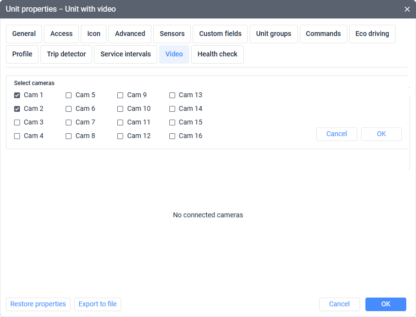 Configuring cameras in the Video tab of the unit properties.
