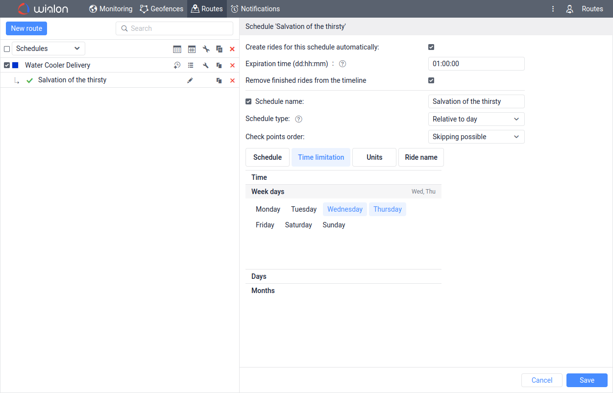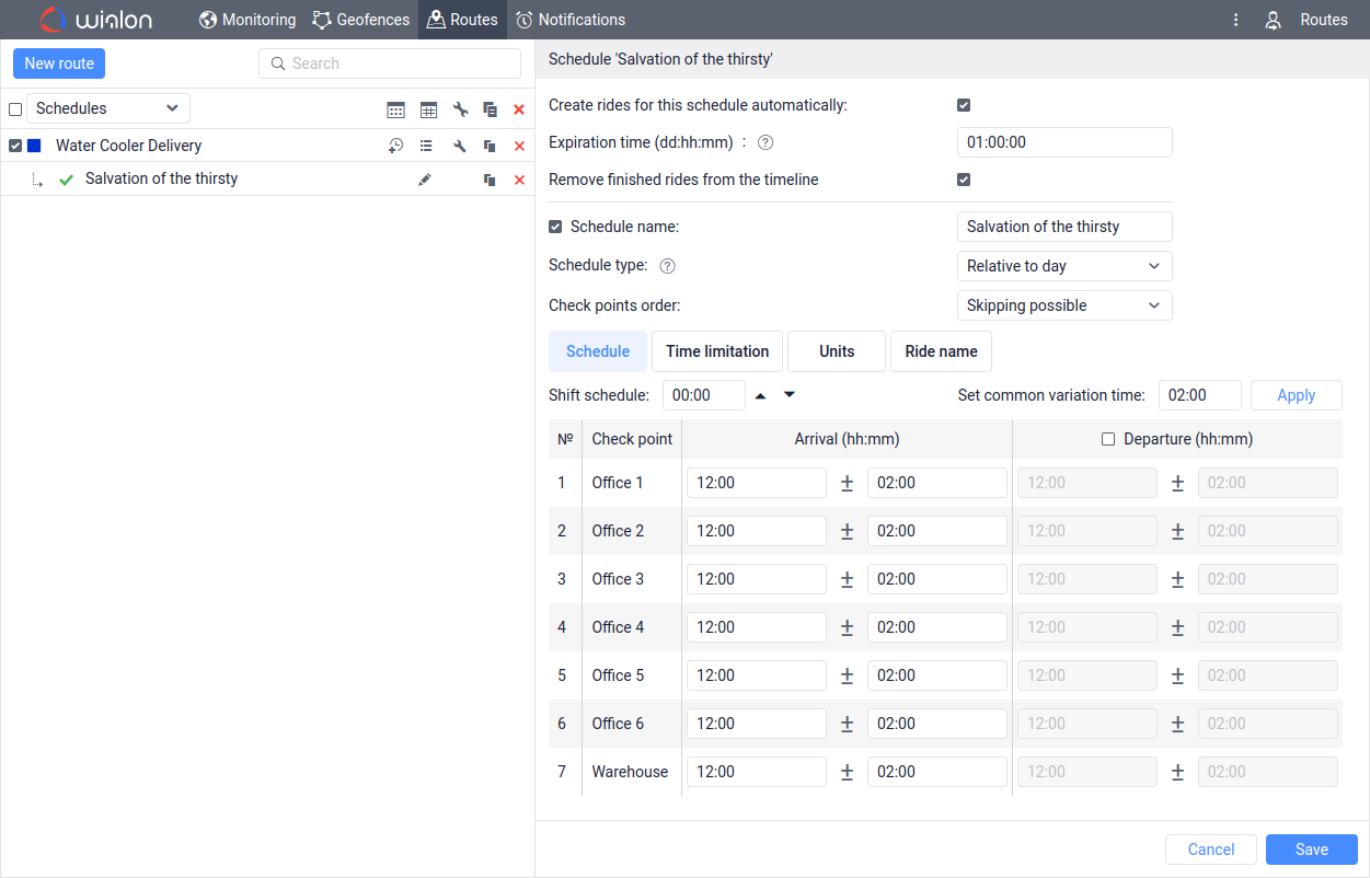 - The ride is done once in the middle of the day, so a relative to day schedule would be suitable. For all check points, the Arrival field can be set to 12:00. The Departure field can be left empty. The Variation field can be set to 2 hours. Time limitations: only Wednesday and Thursday.