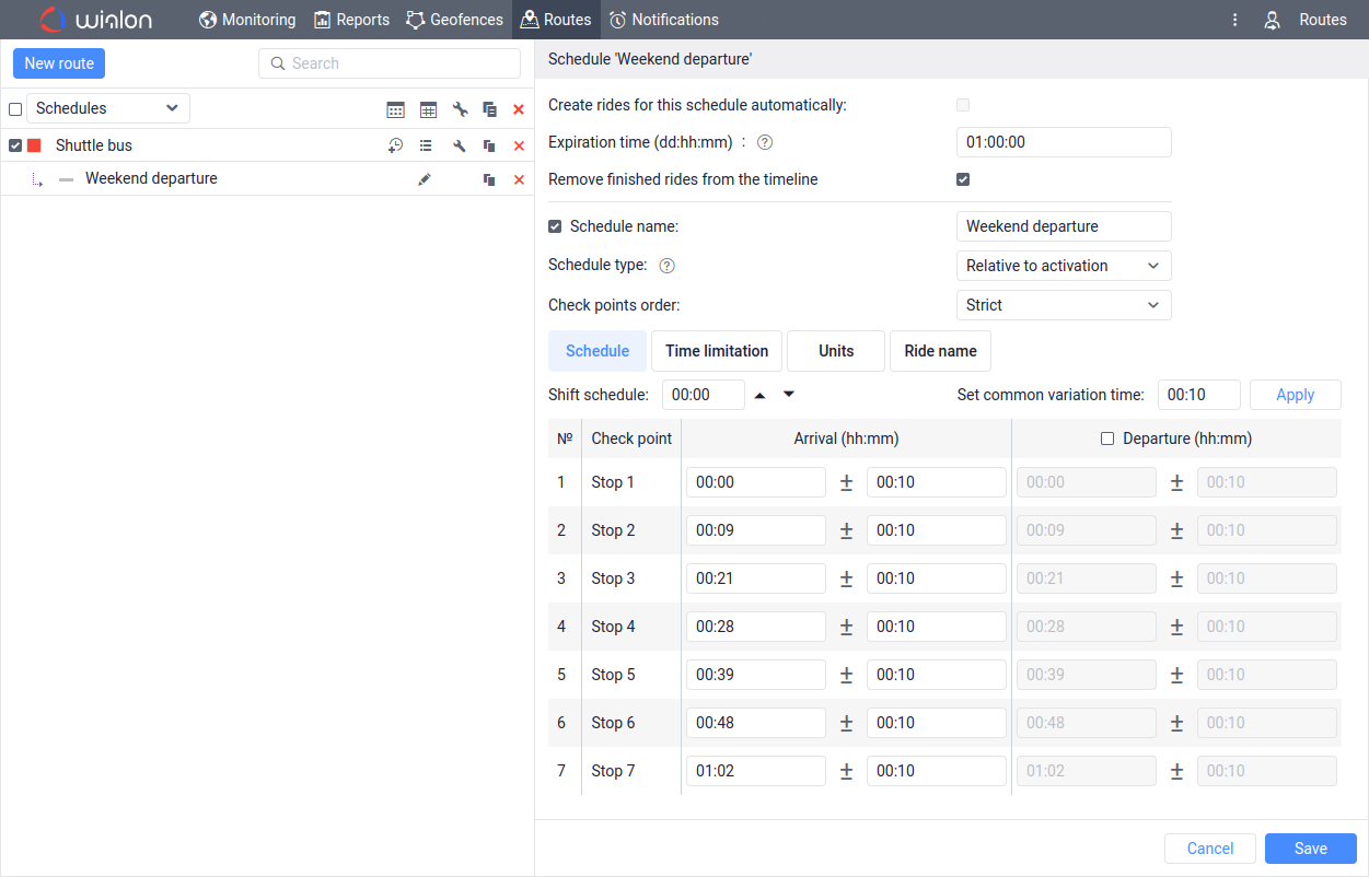 The examples above show how to fill in the Arrival field for different types of schedules. In addition to that, the Departure field can be filled in for each check point, allowing you to record the time that the unit should spend at that point. Additionally, for each time, an acceptable Variation can be specified, which represents the allowed time corridor for a delay or being ahead of schedule that is not a violation.