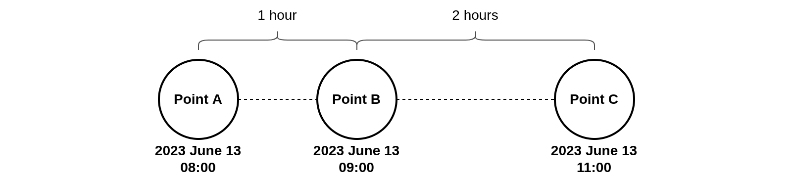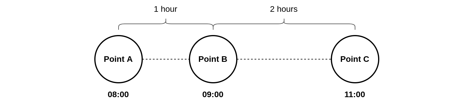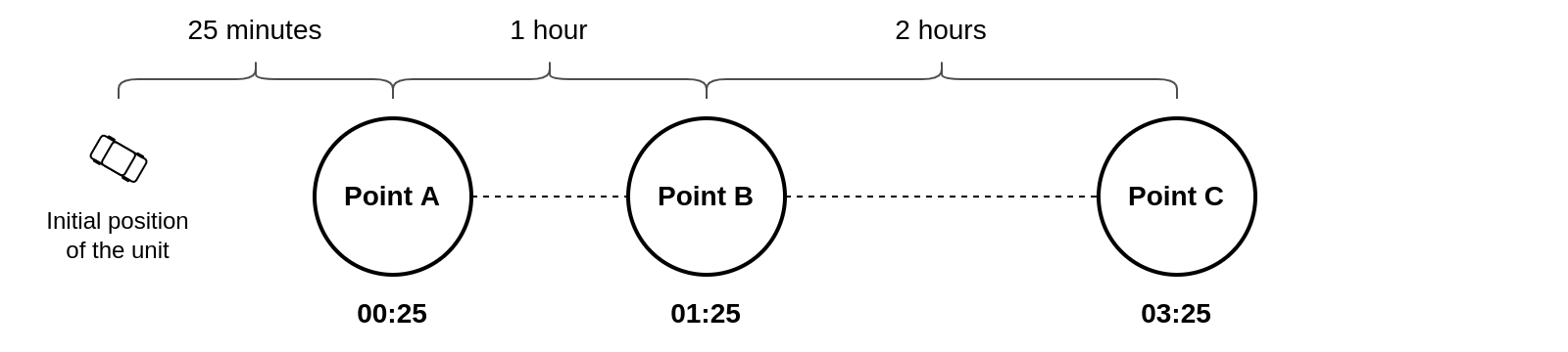 However, there can be a different situation when the ride is activated before the unit enters the first point. In this case, the schedule adjusts the time based on how long it will take for the unit to move from the activation time to the first point, from the activation time to the second point, and so on.