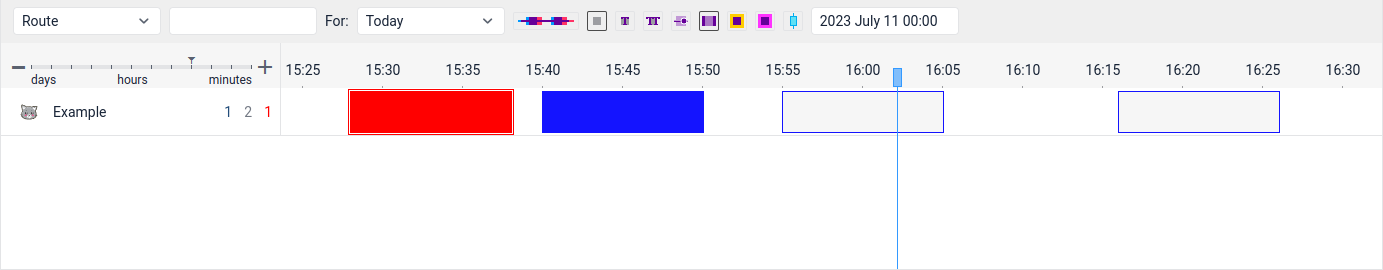 If the vertical line of the current time reaches a check point, it does not mean that the unit has visited the point. The visit can only be recorded by a change in the color of the check point: before the visit, it is indicated by an empty rectangle, and after the visit, the rectangle is filled with the color of the route (in this case, blue), and if the point is missed, the rectangle is filled and outlined in red.
