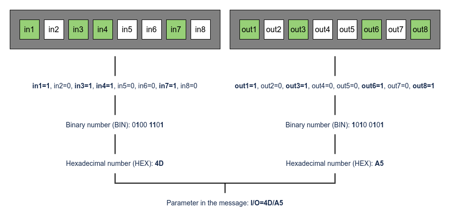 At first, it should be noted that the state of digital inputs and outputs in Wialon is represented as two hexadecimal numbers (HEX) obtained from binary numbers (BIN), in which each bit corresponds to an input/output with the same number. The parameter with these values is named I/O (short for Inputs/Outputs) and contains two numbers separated by a slash: to the left, there is the value corresponding to the state of all inputs, and to the right — the state of the outputs.