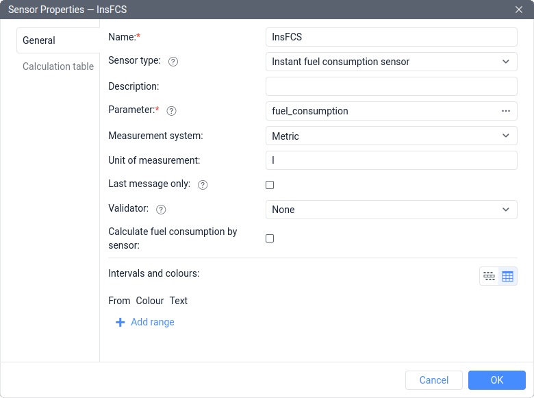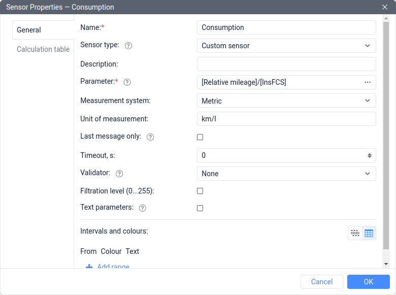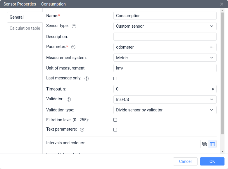 Create a Custom sensor named Consumption with km/l as a unit of measurement. Specify the odometer as a parameter. In the properties of the Consumption sensor, specify the InsFCS sensor as a validator and choose the Divide sensor by validator validation type.