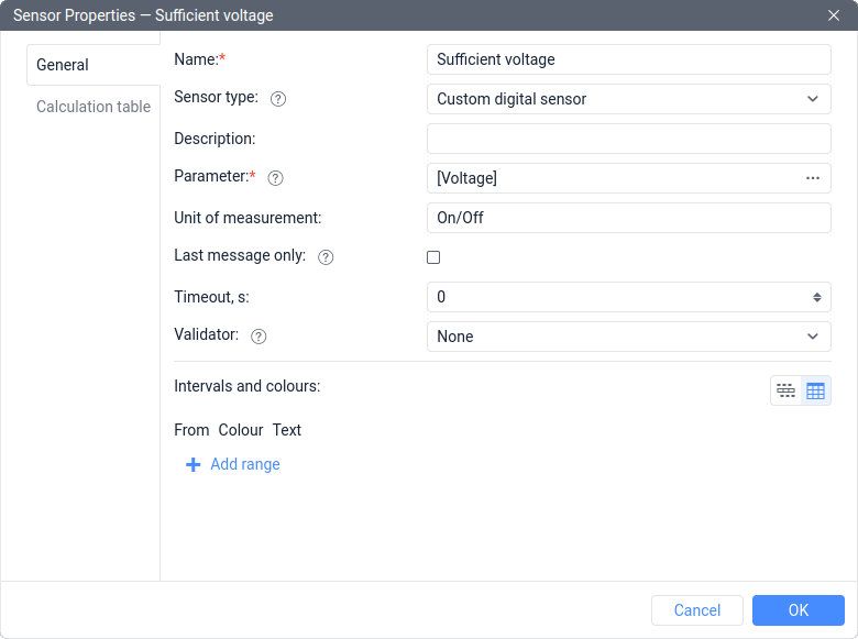 Create a Custom digital sensor named Sufficient voltage based on the [Voltage] expression.