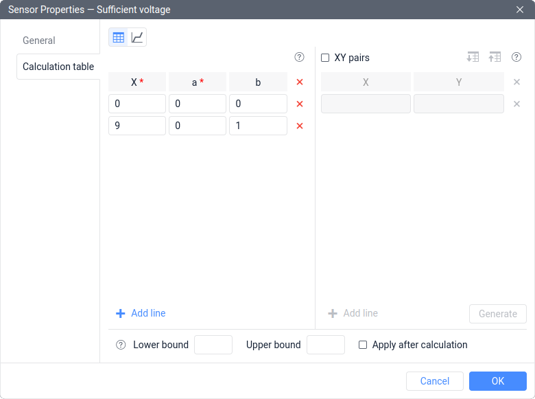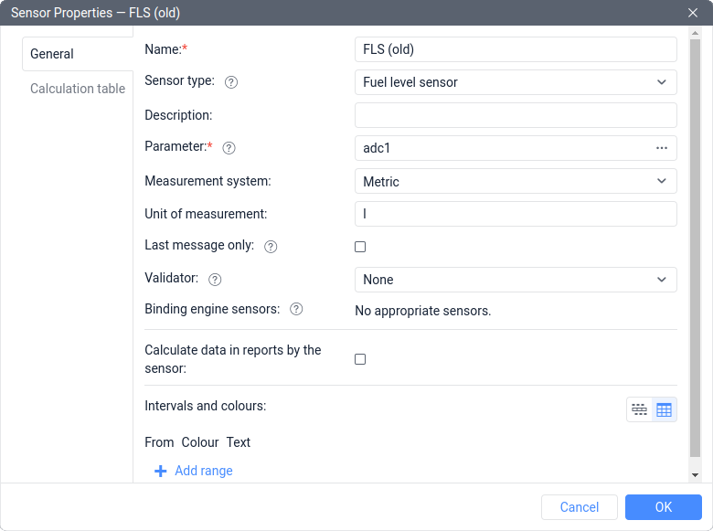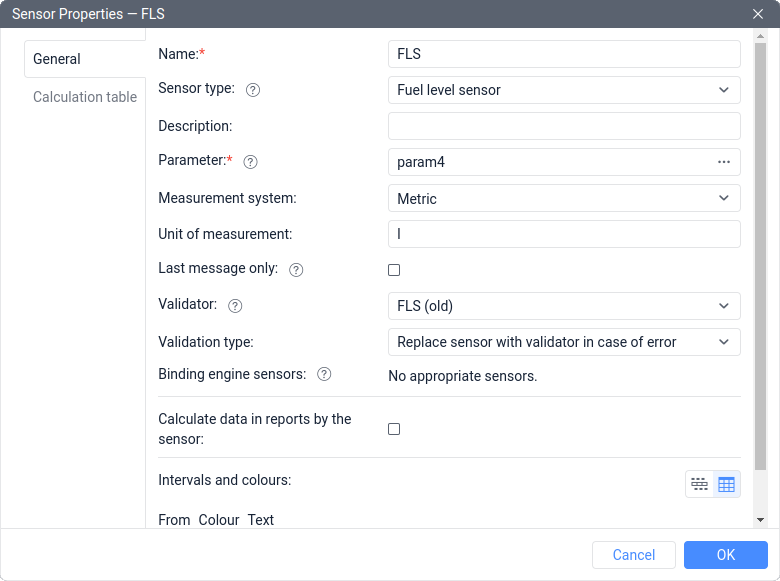 Create a Fuel level sensor named FLS based on the param4 parameter. It is necessary to enter the new calibration table into its calculation table to convert volts to liters. In the properties of FLS, specify the FLS (old) sensor as a validator and select the Replace sensor with validator in case of error as a type of validation.