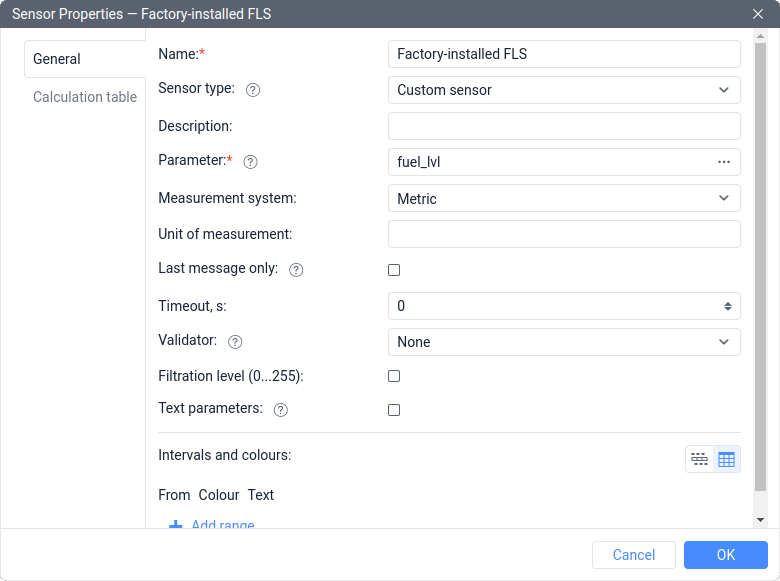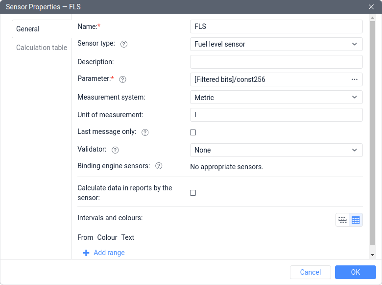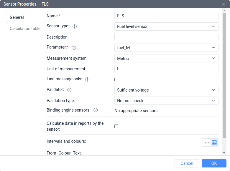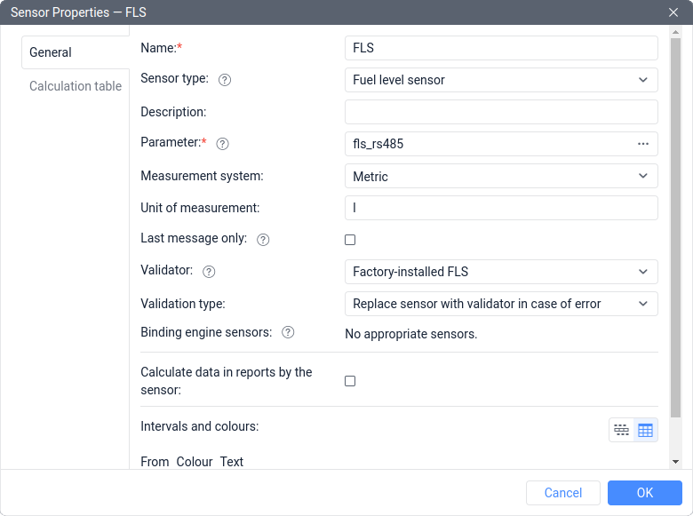 Create a Fuel level sensor named FLS based on the fls_rs485 parameter. It is necessary to enter a calibration table into the FLS calculation table to convert volts to liters. In the properties of FLS, specify the Factory-installed FLS sensor as a validator and select Replace sensor with validator in case of error as the type of validation.