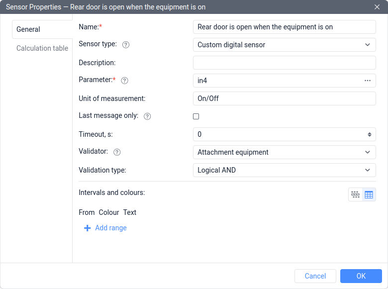 Create a Custom digital sensor named Rear door is open when the equipment is on based on parameter in4. Then select the Attachment equipment sensor as the validator and choose the Logical AND validation type.