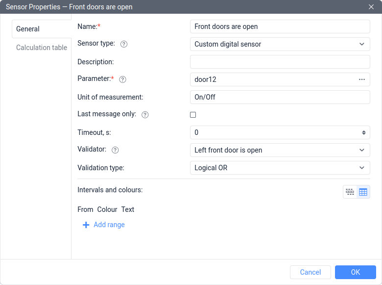 Create a Custom digital sensor named Front doors are open, based on parameter door12. Then specify the Left front door is open sensor as the validator and choose the Logical OR validation type.