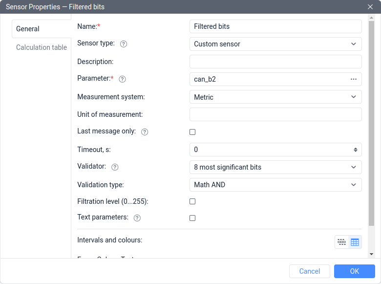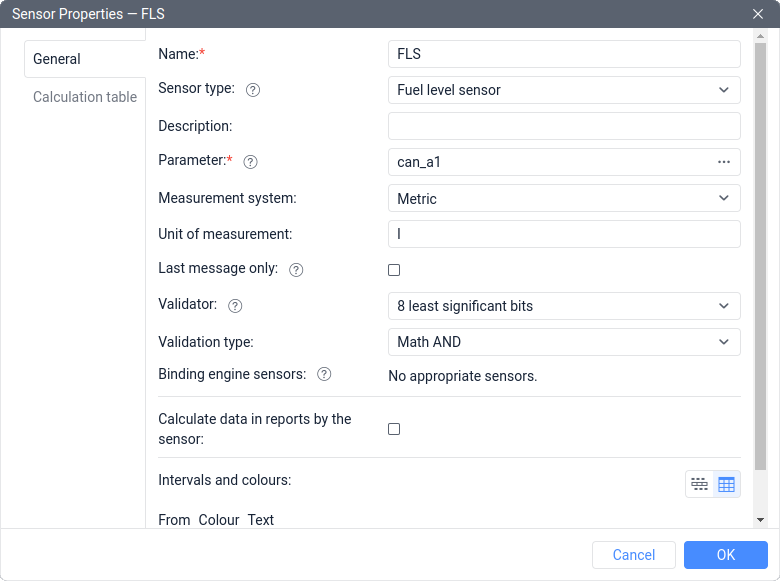 Create a Fuel level sensor named FLS based on the can_a1 parameter. Then select the 8 least significant bits sensor as a validator and choose Math AND validation type. Also, it is necessary to enter a calibration table into the sensor calculation table to convert the result into liters.