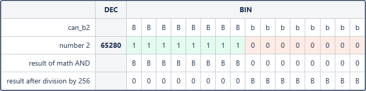 As a result, using the binary representation of the number 65280, the can_b2 parameter was filtered in such a way as to leave only the 8 most significant bits in it, and then they were converted into the least significant bits using the offset.