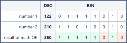 For example, the result of the math OR between the numbers 122 and 210 will look like this: