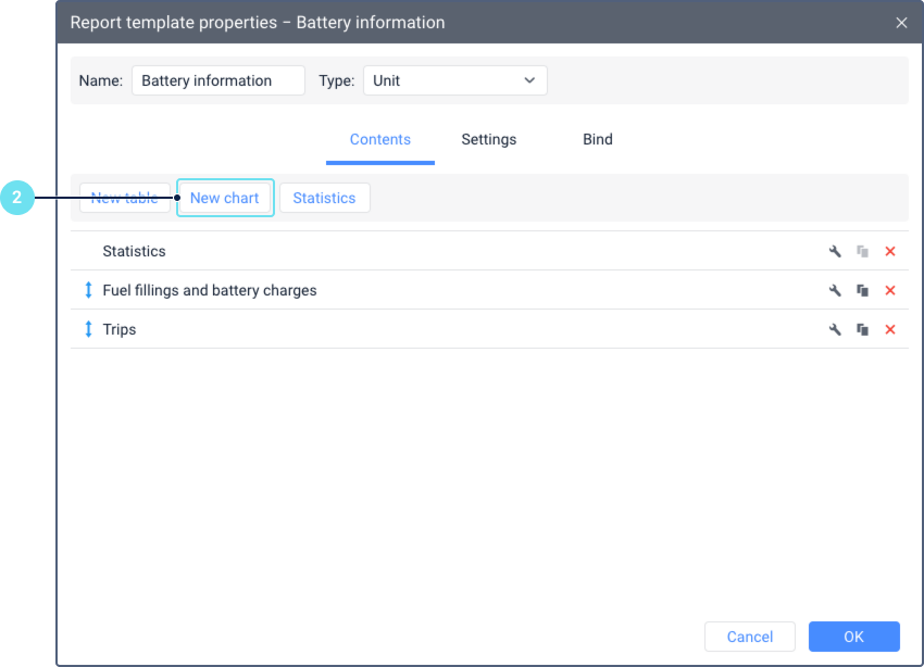 - Tables of the following types: Engine hours, Fuel filling and battery charges, Trips, Geofences, Trips between geofences, Unfinished trips, Summary, Chronology, Orders, Assignments. In their columns, you can display data on the battery level, the number and volume of charges, battery consumption.