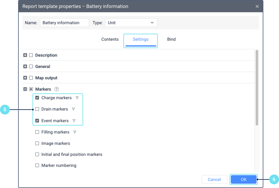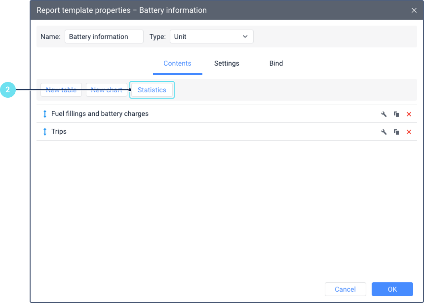 To add statistics on battery charging and consumption to the report template, do the following: