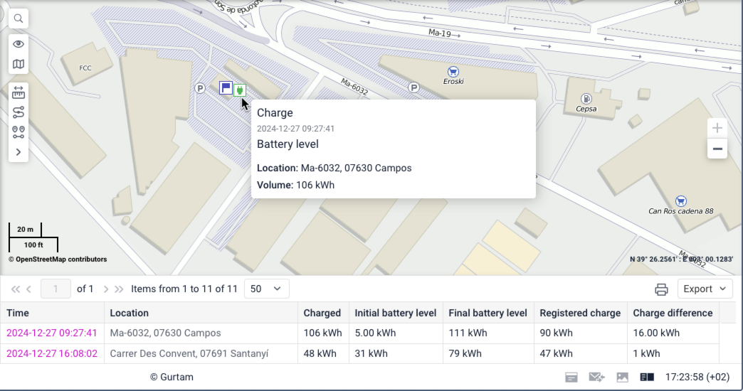 Result: The work area displays a table with data on the battery charges registered manually and automatically, and a map with markers showing charge locations.