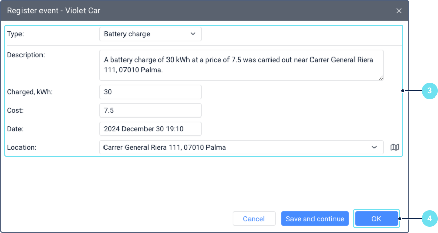 - In the window, select the Battery charge type, specify the amount and cost of the charge, as well as the unit location during charging. The Description and Date fields are filled in automatically, but you can edit them if necessary.