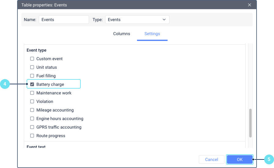 Result: The entered data on the battery charge is saved in the unit history. Next sections describe how to present this data in the report tables and on tracks.