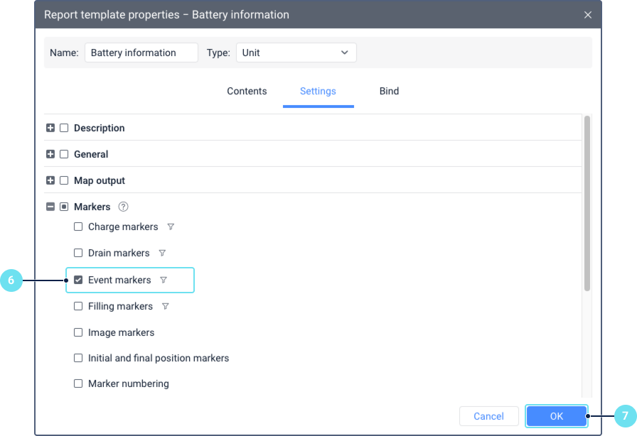 - In the template properties, go to the Settings tab and select Event markers to see the charging location on the map.