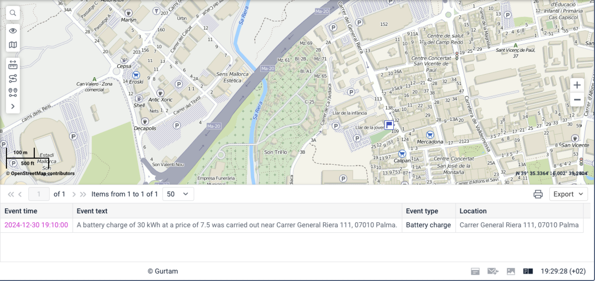 Result: The work area displays a table with data on battery charges and a map with markers showing the charging locations.