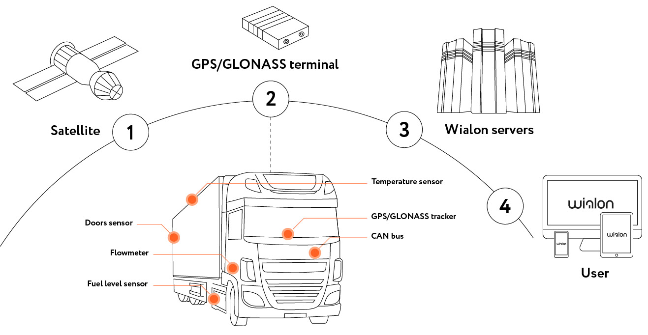 The AVL hardware installed in a vehicle figures out the location of that vehicle with help of satellites, gathers data from various accessories and sensors and transmits the data through a cellular or satellite network to Wialon data center. This data can be interpreted to monitor in the Wialon web interface the whereabouts and other parameters of a vehicle in real time.