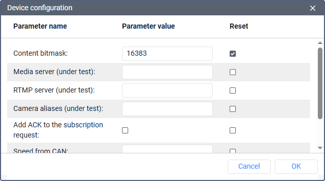 | Content bitmask | Here you can specify a bitmask which determines the parameters that should be sent by the device. To send all the available parameters, enter the value 16383. Content bitmask values are described below. |