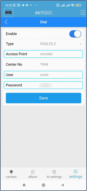 Specify the APN settings: fill in the Access point, User, Password fields according to the instructions of your mobile operator. Click Save.