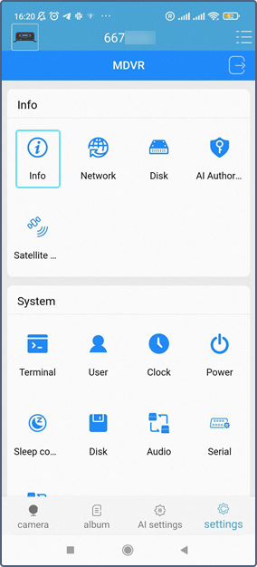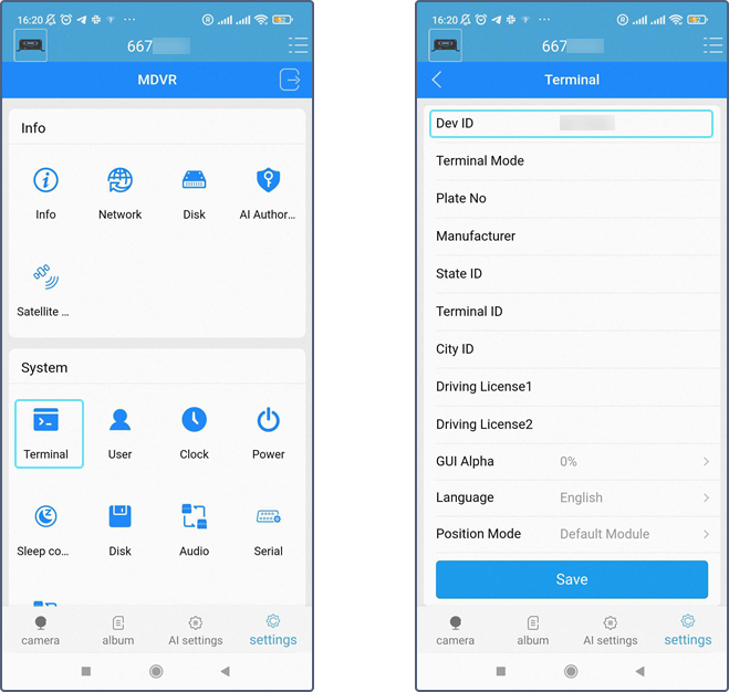 If you need to change the ID, select the Terminal item of the System section in the settings. Change the ID in the Dev ID field and click Save.