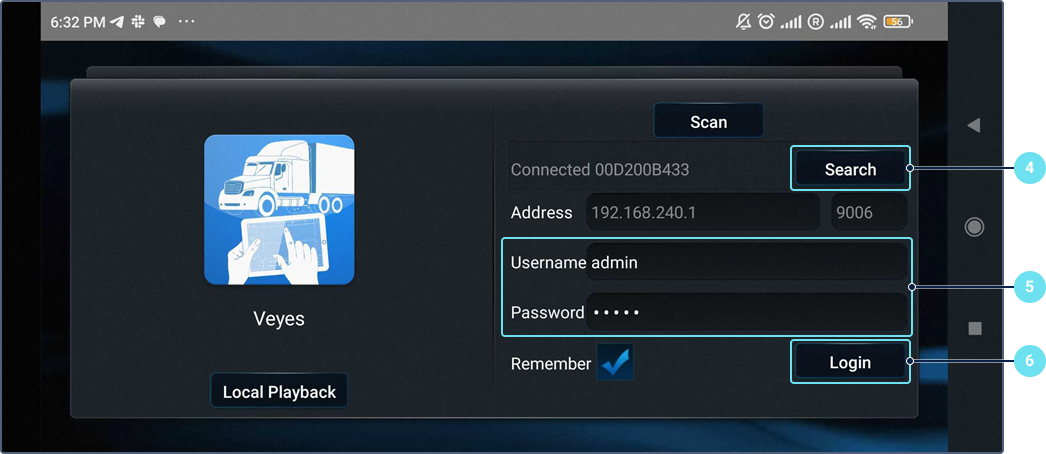 Tap Search to find the Wi-Fi hotspot. Initially, the hotspot name is the device serial number (specified on the device label) or the license plate number if it was configured previously.