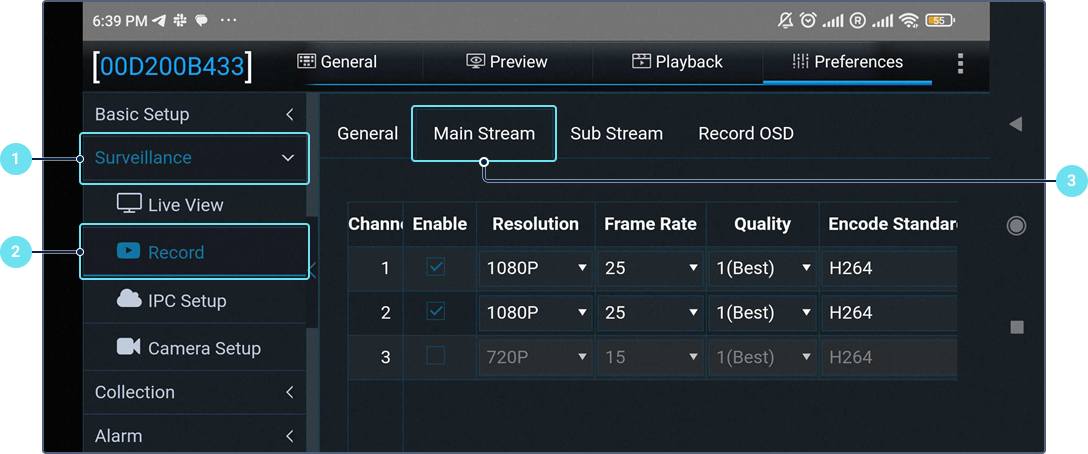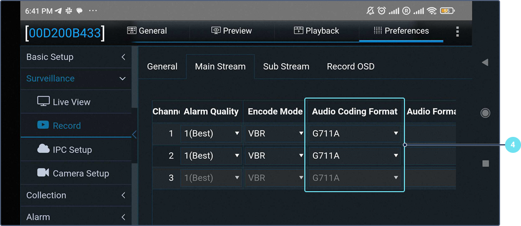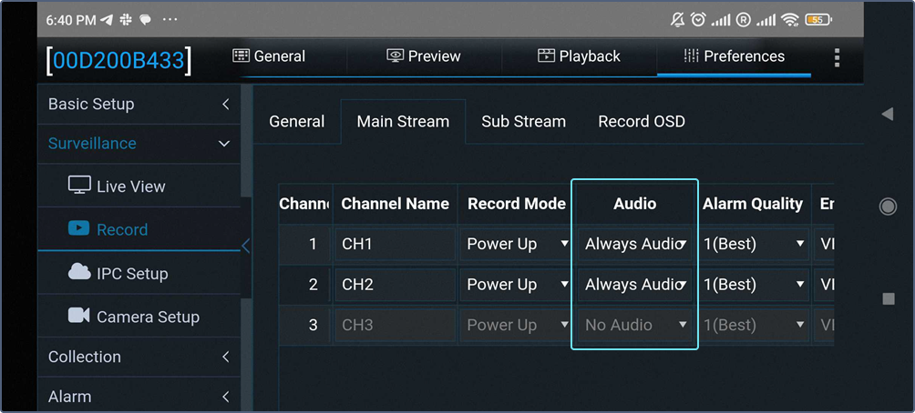 On the Main stream tab, configure video quality settings for the main stream. Audio options include Always audio and No audio, with Always audio as the default.
