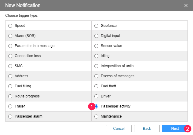 - Select the Passenger activity trigger type.