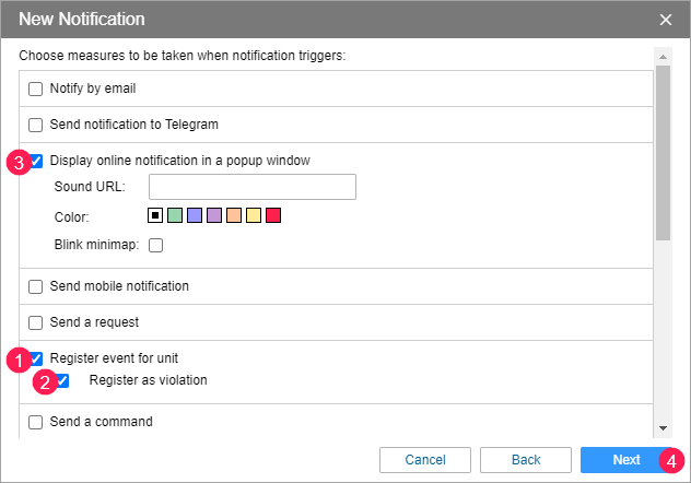 - Select the Register event for unit action and enable the Register as violation option. To display the notification in Wialon, select the Display online notification in a popup window action as well.