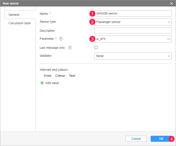 Go to the Sensors tab and create a sensor of the Passenger sensor type. In the Parameter field, specify io_875.