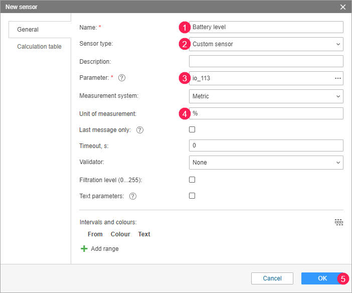 If necessary, create a custom sensor to determine the battery level. In the Parameter field, specify io_113. In the Unit of measurement field, specify %.