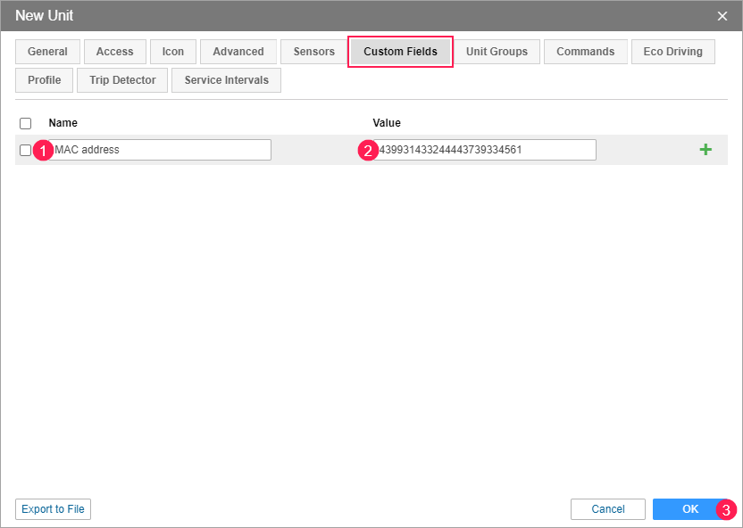 On the Passengers tab, create a passenger named as the unit which corresponds to it. In the Code field, specify the same MAC address of the device as in the custom field of the corresponding unit.