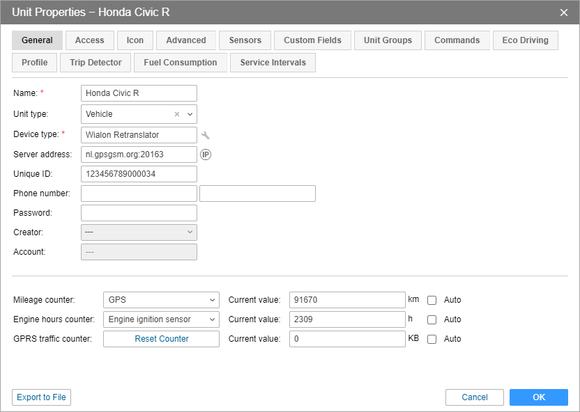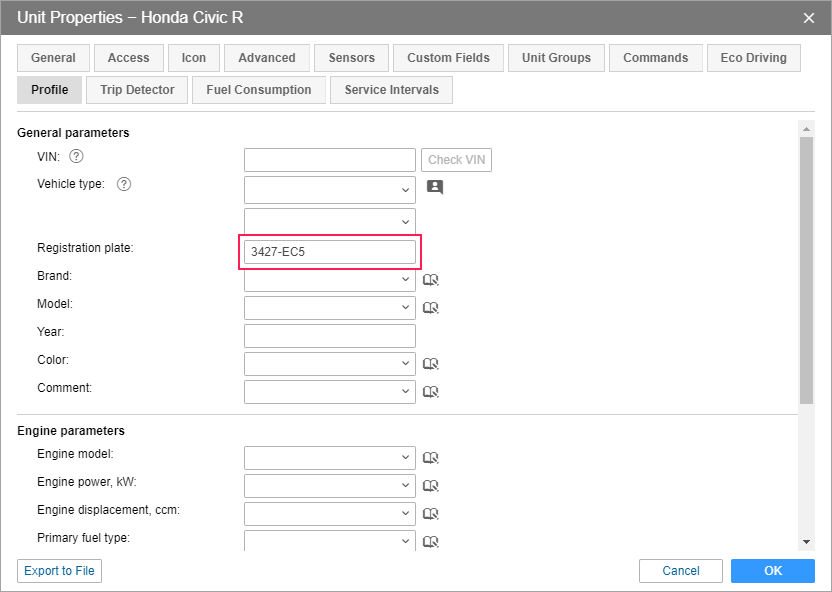 - Open the properties of the unit for which you want to configure automatic toll payment (or create a new one).