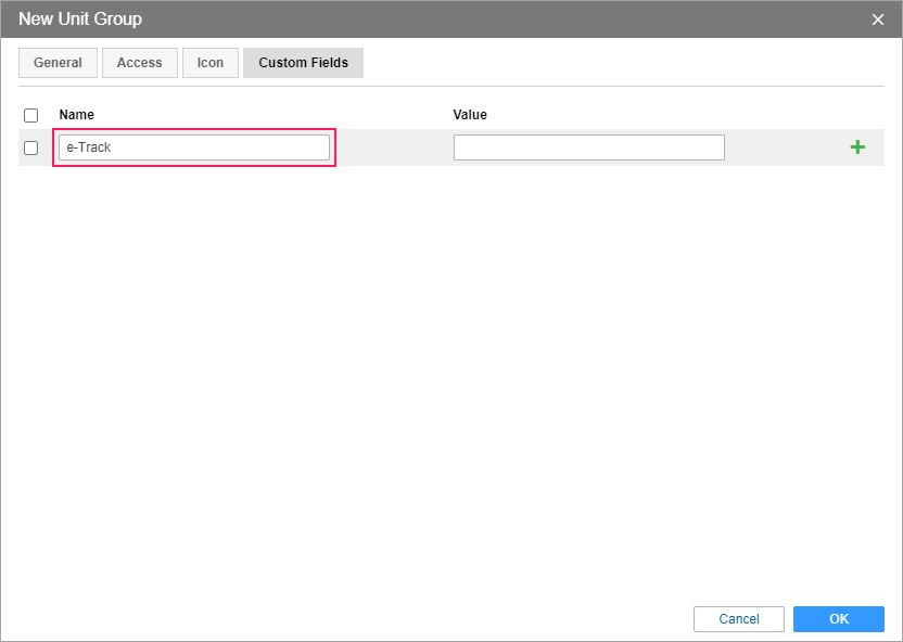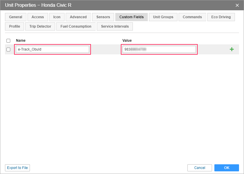 - Go to the Custom fields tab and add a custom field named e-Track_ObuId. In the Value field, specify the on-board unit ID (OBU ID) received after signing up for the e-track platform.