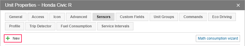 - Go to the Sensors tab and click New. If an ignition sensor has already been created for the unit, skip this and the following step.