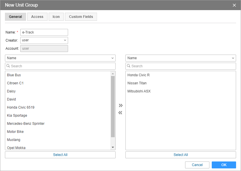 - Create a unit group and add to it units for which you want to configure automatic toll payment.