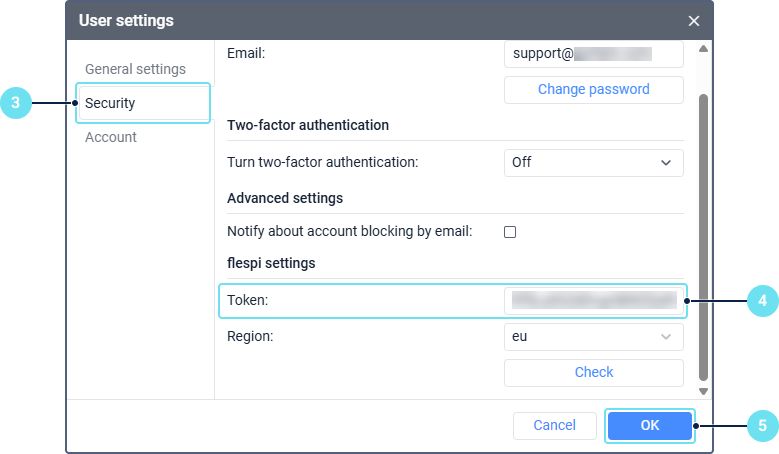 - In the Token field of the flespi settings section, enter a flespi Master token.