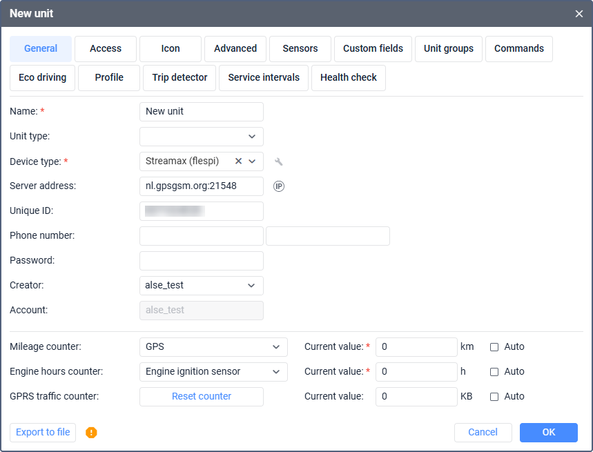 - Device type: your video tracker model with the (flespi) suffix. In this example, we use Streamax (flespi).