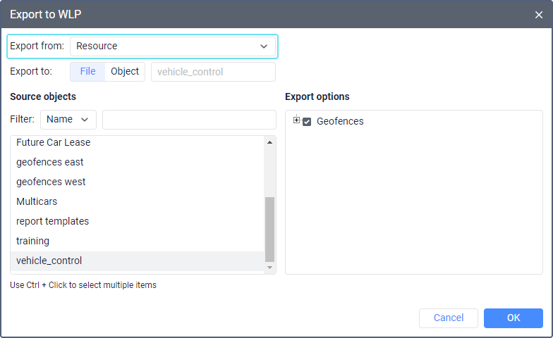 For example, a report template contains settings for filtering intervals by geofences. After exporting the template to another resource, you should check these settings because geofences can be bound to the template only within one resource. Thus, you should bind the geofences to the template again in the new resource. Also, the connection with units may be lost if they are selected for the interval filtering, and the creator of the new resource doesn’t have access rights to these units.