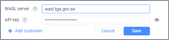 On the Integrations tab, fill in the Wasl server and API key fields and click Save.