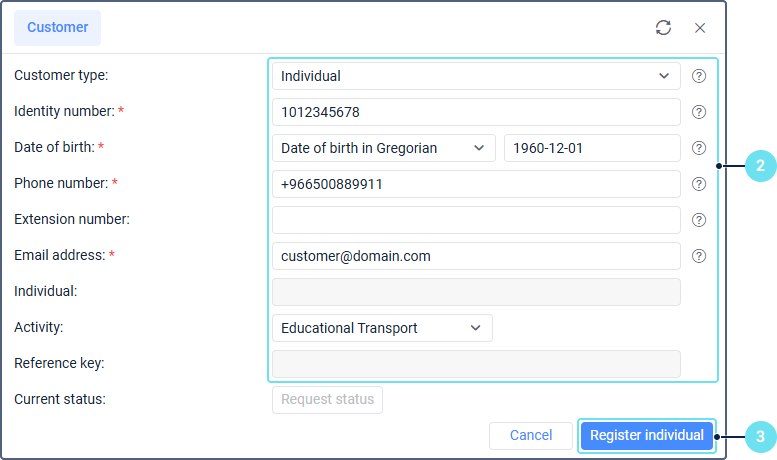 Field Description Customer type* Select the customer type: an individual or an operation company. Identity number* Specify the identity number of the customer. It’s the unique number provided to companies or individual enterprises by the Ministry of Interior (MOI). If the customer is an individual, the identity number starts with 10. If it’s a company, it starts with 700. In both cases, it consists of at least 10 digits. Date of birth* Select the type of calendar (Gregorian or Hijri) and specify the customer’s date of birth. Available only when registering an individual customer. Commercial record number* Specify the company’s commercial registration number. It is the unique number provided by the Ministry of Commerce, indicated in the upper-left corner of the commercial certificate. It consists of at least 10 digits. Available only when registering a company. Commercial record issue date in Hijri* Specify the issue date of the company’s commercial registration in accordance with the Hijri calendar. Available only when registering a company. Phone number* Enter the phone number of the organization. It should start with +966 and contain 13 characters including the plus sign. Extension number Enter the extension number of the customer’s work phone. It may consist of up to 4 digits. Email address* Specify the email address of the customer. Manager name* Specify the name of the company’s manager. Available only when registering a company. Manager phone number* Enter the phone number of the company’s manager. It should start with +966 and contain 13 characters including the plus sign. Available only when registering a company. Manager mobile number* Enter the mobile phone number of the company’s manager. It should start with +966 and contain 13 characters including the plus sign. Available only when registering a company. Individual The full name of the individual. Filled in automatically after registering an individual customer. Company name The full name of the company. Filled in automatically after registering an operation company. Activity The activity type of the customer. The following options are available: default, speciality transport, bus rental, educational transport, motorcycle delivery. Reference key The reference key of the customer. Filled in automatically after registering an individual or a company. -