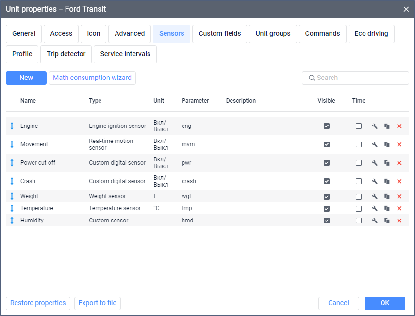 If the required units have already been created, skip this stage. If they belong to another user’s account, you must have the View object and its basic properties access right to this account. - Configuring the required sensors in the unit properties.