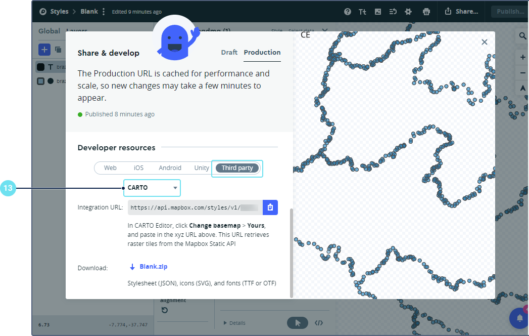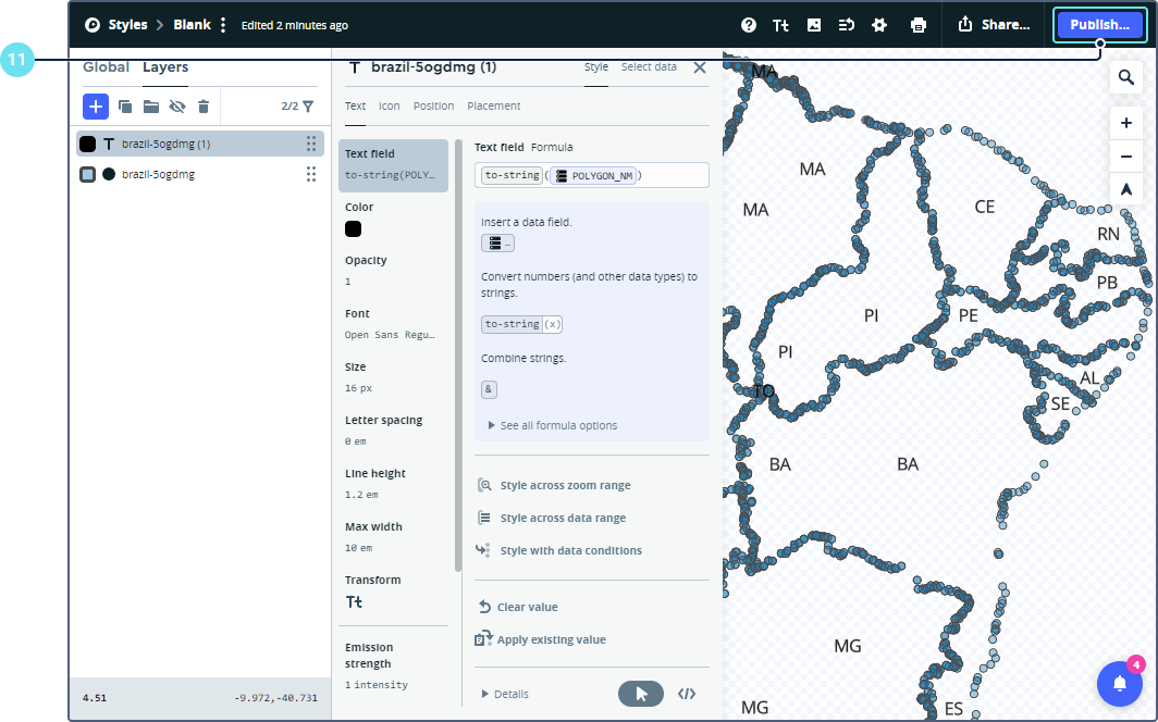 Later you can edit the created map, add new data, change the style, etc. Remember to use the Publish button to save the changes.