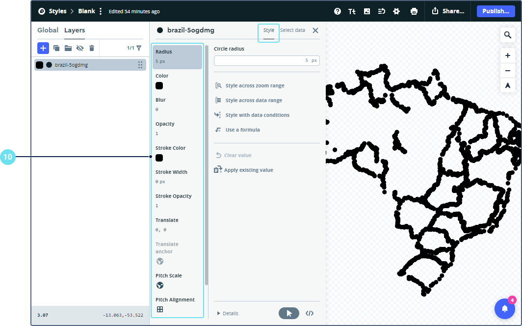 If necessary, edit the style of the selected layer on the Style tab. You can add multiple layers, captions, adjust color, stroke, borders, font, etc.