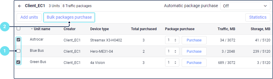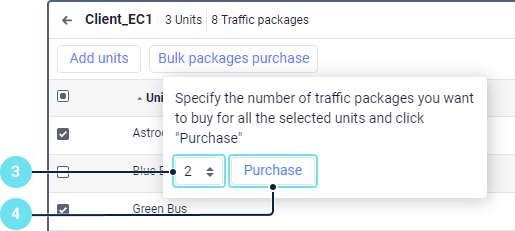 - Select the units for which you want to buy traffic packages. To select all the units at once, check the box next to the Unit name heading.