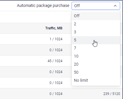 The system checks for available traffic every 15 minutes. Thus, a new traffic package is purchased immediately after the previous one is used up. A record of its purchase is shown in the unit log. When the number of packages purchased for a unit (the value in the Total purchased column) reaches the limit, the automatic purchase is no longer available for this unit. In this case, you should buy a new package for the unit manually or set a higher limit on the number of packages per month.